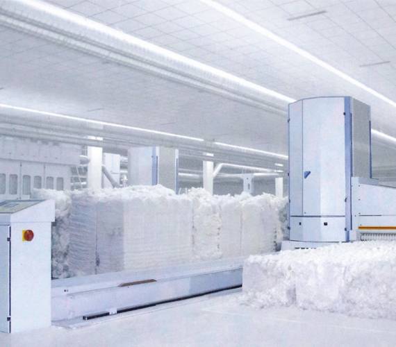 抓棉机,又称抓包机。开清棉联合机组中从棉包抓取棉纤维的机器。通常排列在联合机的首位,有上抓式、下抓式;小车往复式、小车(或棉包台)回转式:小车升降式、平台升降式等。一般使用刀片(或锯片)打手和肋条,亦有用角钉机件或弹簧钳等从棉包表面抓取纤维,由气流或机械输送给后道机器继续加工。其结构在不断改进,如采用上抓式,实现了多包(40~80包)混棉;安装定量抓取等自控装置,便于更换混和比例和提高混和比例的准确率。
